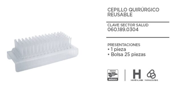 DESCRIPCION:CEPILLO PARA USO QUIRURGICO. DE PLASTICO, DE FORMA RECTANGULAR, CON DOS AGARRADERAS LATERALES SIMETRICAS Y CERDAS DE NYLON.